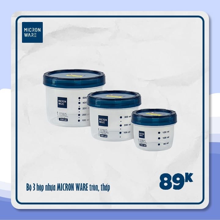 Tên sản phẩm: Bộ 3 hộp nhựa tròn kín hơi, kháng khuẩn (9630 + 9631 + 9632)Mã sản phẩm: 9632/3Dung tích: 275ml + 500ml + 725mlThương hiệu: Micron WareChất liệu: Nhựa PP không chứa BPA - một hoạt chất gây hại cho sức khỏe và ảnh hưởng đến khả năng gây ung thư ở ngườiChịu được...