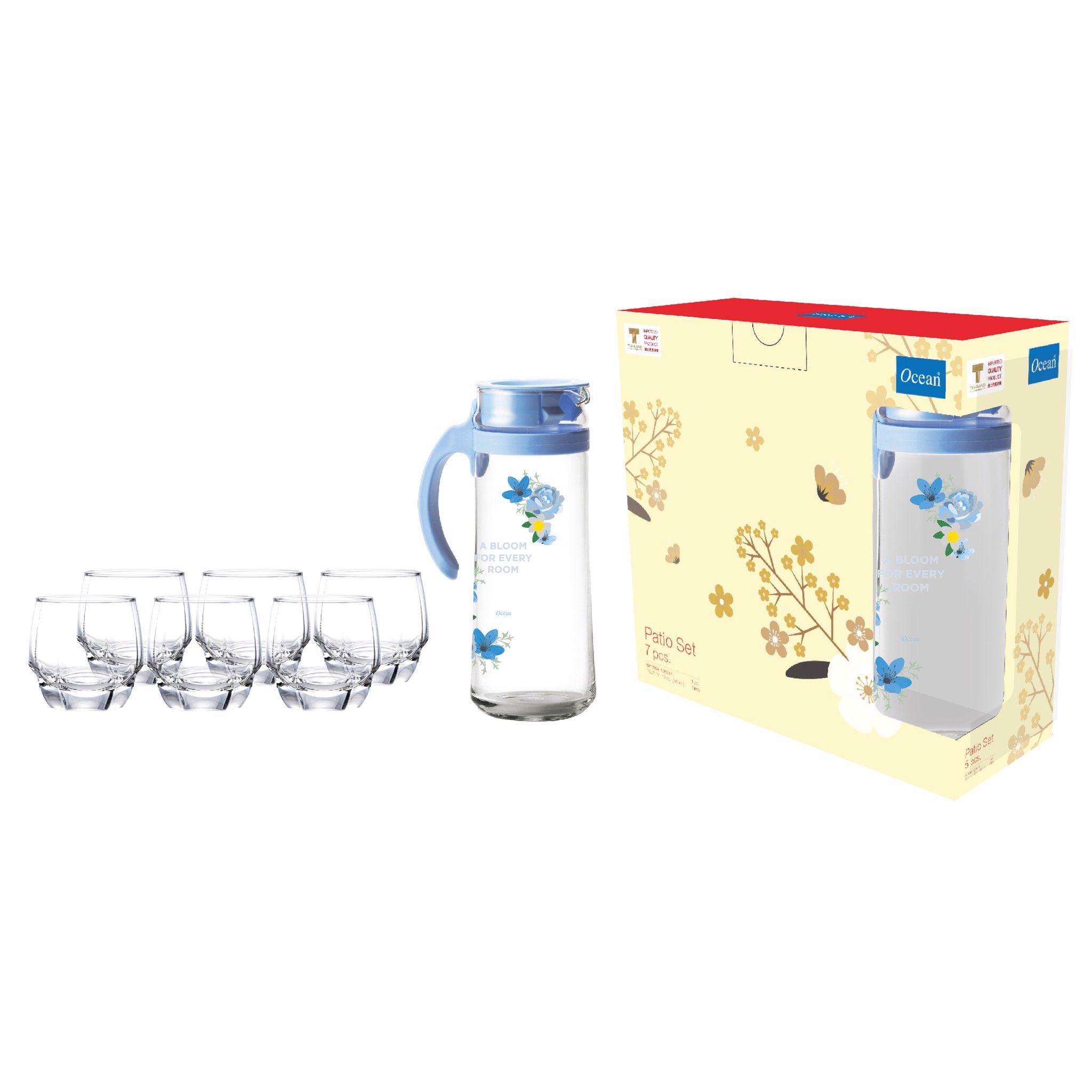 Tên sản phẩm: Bộ bình thủy tinh Patio Blossom Blue - 3GS000007X0179Mã sản phẩm: 3GS000007X0179Thương hiệu: OceanDung tích: Bình 1.2L, ly 340ml.Chất liệu: Được làm từ cát trắng Silica cao cấp, nhựa PP cứng cáp chắc chắnCông dụng: chứa đựng nước uống các loạiChi tiết: Có độ trong suốt caoKhông chứa chì hay kim loại...