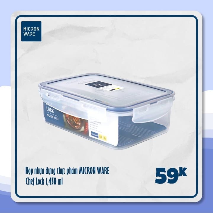 Tên sản phẩm: Hộp nhựa đựng thực phẩm Chef Lock 1,450ml - JCP0004Mã sản phẩm: JCP0004Kích thước: 15.5cm x 21.5cm x 7.1cmDung tích: 1,450mlThương hiệu: Micron WareChất liệu: Nhựa PP không chứa BPA - một hoạt chất gây hại cho sức khỏe và ảnh hưởng đến khả năng gây...